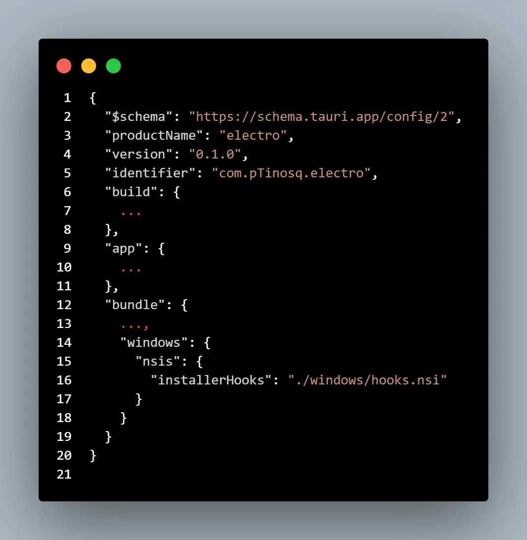 } Here is an example of a Tauri config file with the Windows NSIS installer hook property: